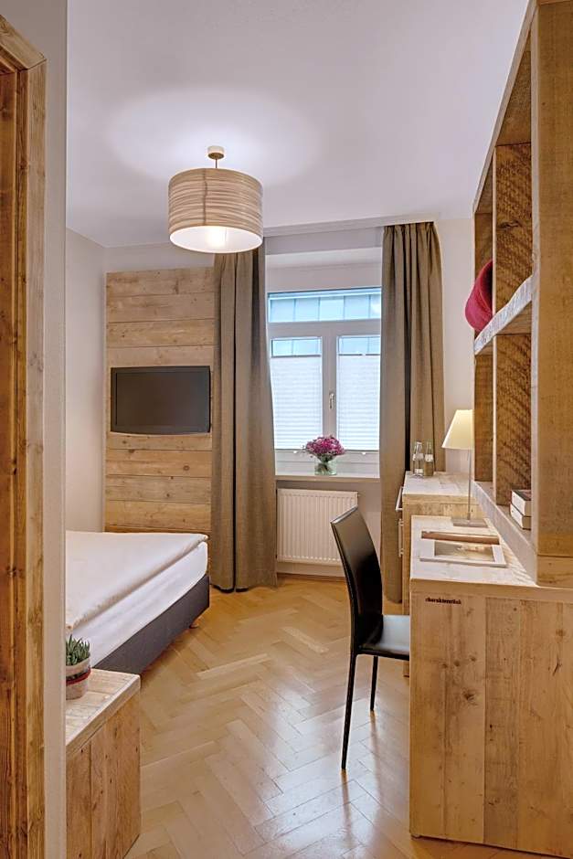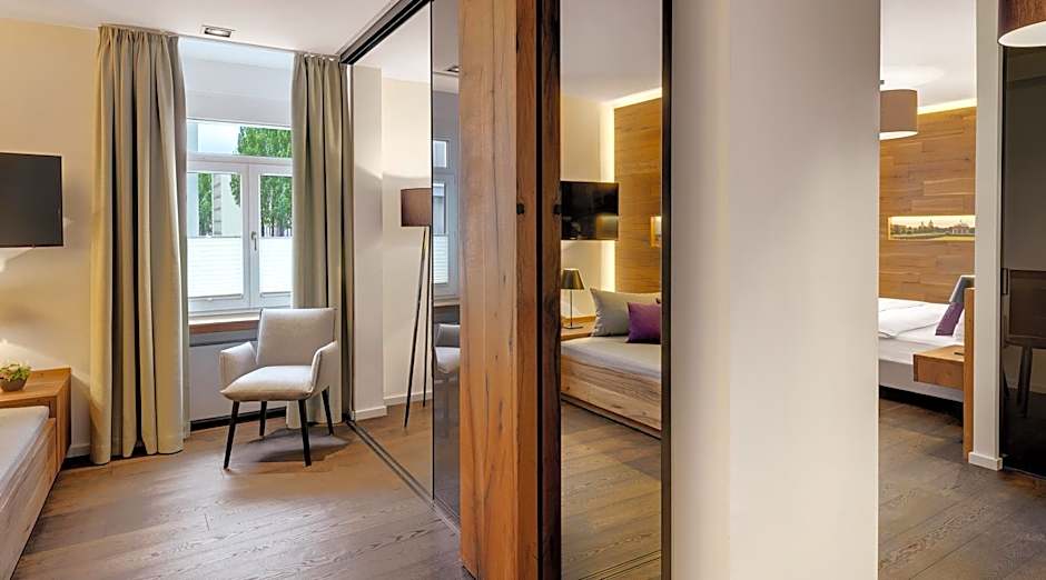 The large Hofgarten Suite is the property's centerpiece where much attention was paid to details and sustainability in its design. A high quality solid wood floor and a massaging stone floor in the spa shower with panorama ceiling, as well as the sitting-room area, which can be completely separated off by sliding doors. There is a flat-screen TV and reading lights, air-conditioning, a walk-in wardrobe, noise-insulated windows, a large bed with high quality bedding and selected Fair Trade care products in the bathroom and shower.